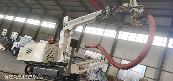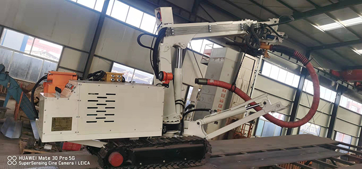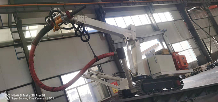 CPF-6OLY型礦用混凝土輔助噴射車(以下簡稱噴漿機械手)主要用于煤礦井下煤巷、半煤巷、全巖石掘進巷道與混凝土噴射機配套使用,代替人工噴漿作業(yè),滿足噴漿工藝要求,整機小巧、靈活、耐用、適應能力強,可用于大型噴漿機組無法進入的巷道,實現(xiàn)噴漿無線操作、機械化作業(yè),減輕人工噴射勞動強度大的問題。整機完全采用無線遙控操作、液壓控制,工作性能安全可靠。下車液壓系統(tǒng)負責行走、上車液壓系統(tǒng)負責噴射,上下車動作手動切換,防止誤操作。整機具有結(jié)構(gòu)穩(wěn)定可靠,動作平穩(wěn),噴射范圍大,自由度多,遙控操作靈活,噴射平整度好,回彈少,噴射效率高、施工質(zhì)量好,可實現(xiàn)遠程控制,操作人員可位于在可視情況好、粉塵濃度少,較為安全的位置操作,保證使用人員安全。